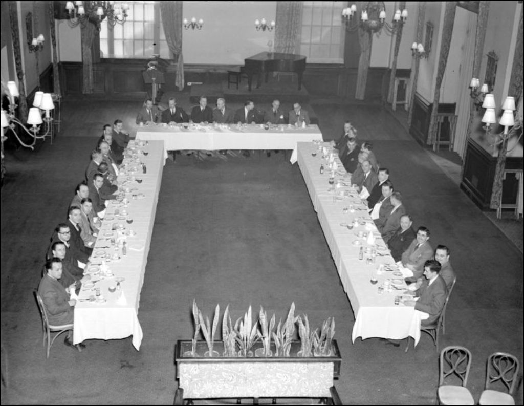 - Dîner-causerie réunissant une trentaine de membres de l'Association des hôteliers du Québec à l'hôtel Queen's de la rue Windsor à Montréal. La réception est suivie d'une visite des studios de l'agence de distribution Renaissance Film (E6,S7,SS1,P046726). Nous reconnaissons le directeur général de l'Association des hôteliers, Gérard Delage et le directeur de Renaissance Film dans une salle de projection (E6,S7,SS1,P046728). Ce reportage a été préparé pour l'Office provincial de publicité et le ministère de la Jeunesse