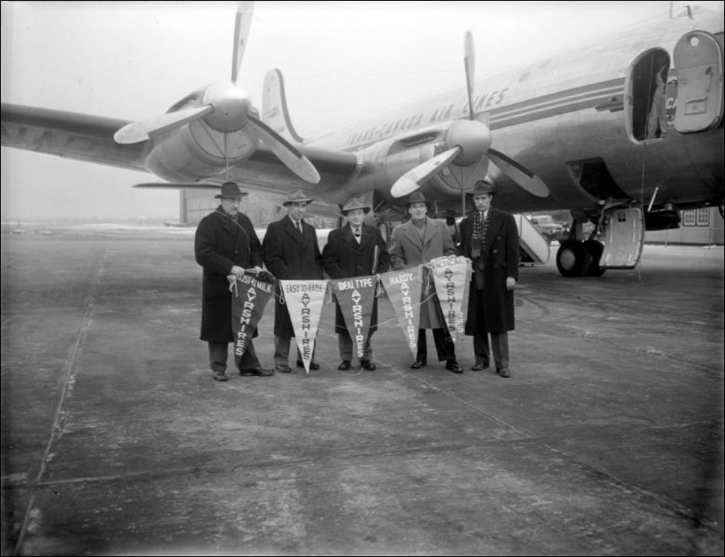 À l'aéroport de Dorval, un groupe d'agronomes du ministère de l'Agriculture montent à bord d'un avion de la Trans Canada Air Lines. Ils déploient une banderole portant l'inscription «Ayrshires» correspondant au nom d'une race bovine. Reportage produit pour le Service des agronomes du ministère de l'Agriculture
