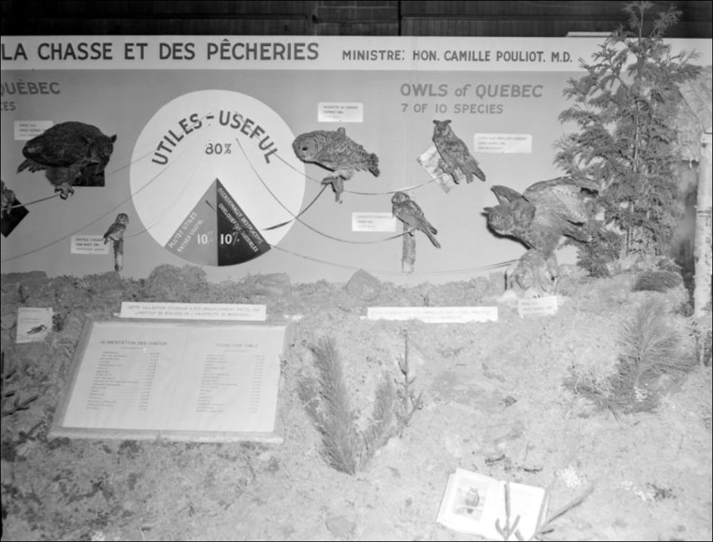 Dans le cadre de l'exposition sportive de Montréal, nous découvrons le kiosque du ministère de la Chasse et des Pêcheries consacré à la répartition en territoire québécois de diverses espèces d'oiseaux notamment des hiboux. Le kiosque comprend des présentoirs, tableaux explicatifs, graphiques et spécimens de taxidermie. Images prises pour l'Office de biologie, ministère de la Chasse et des Pêcheries
