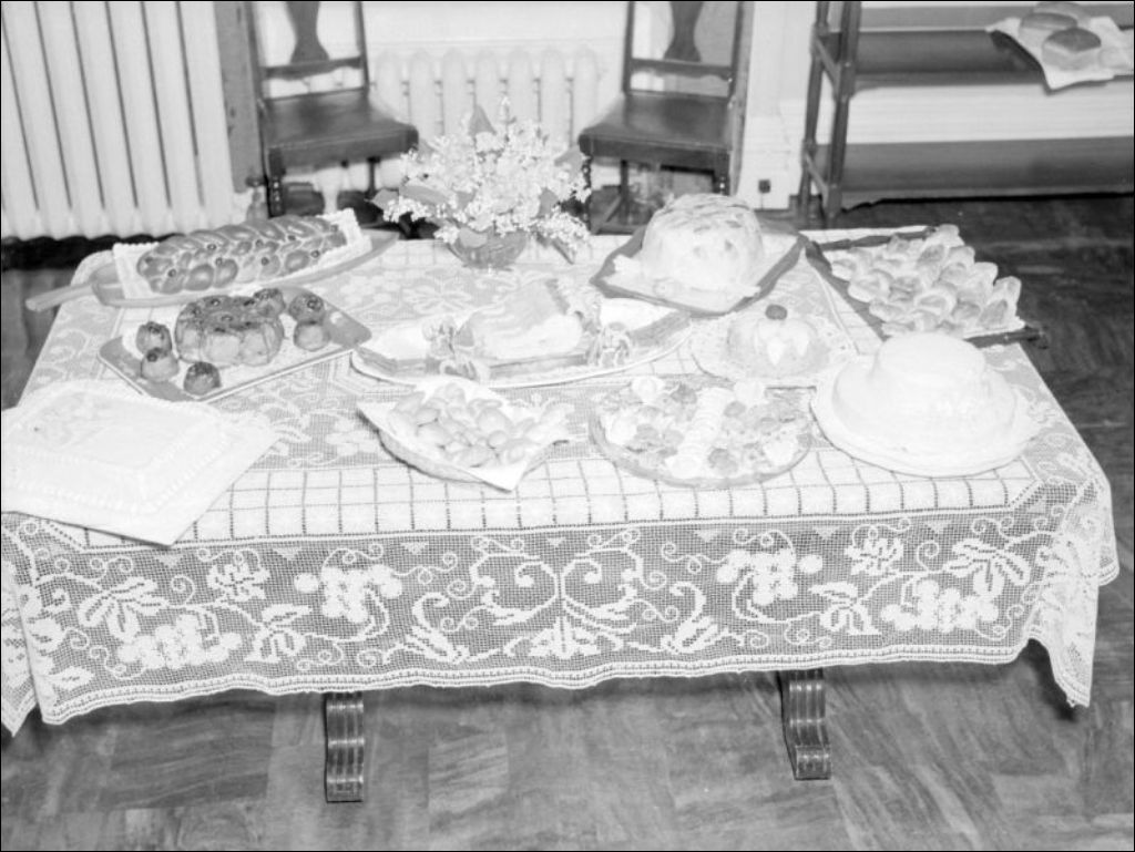 - Réalisations des étudiantes de l'École ménagère provinciale présentées lors d'une exposition. Les travaux sont liés aux spécialisations en art culinaire (E6,S7,SS1,P047221), couture, dessin de mode (E6,S7,SS1,P047222, E6,S7,SS1,P047224), technique du cuir repoussé (E6,S7,SS1,P047223). On y présente des robes et des tailleurs (E6,S7,SS1,P047226 à E6,S7,SS1,P047228). Reportage préparé pour l'École ménagère provinciale, rue Sherbrooke Est à Montréal et le Secrétariat de la province