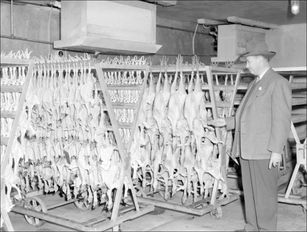 - Installations d'une coopérative avicole régionale située à Saint-Norbert, comté de Berthier. La machinerie industrielle sert aux opérations de transformation soit l'abattage (E6,S7,SS1,P047243), l'ébullition (E6,S7,SS1,P047245), la réfrigération (E6,S7,SS1,P047244), l'emballage (E6,S7,SS1,P047241, E6,S7,SS1,P047249), l'entreposage (E6,S7,SS1,P047240) et le transport (E6,S7,SS1,P047248) des volailles. Nous assistons également à l'opération de mirage des oeufs à la coopérative avicole régionale de Québec-Ouest (E6,S7,SS1,P047250). Reportage réalisé pour le Service d'aviculture du ministère de l'Agriculture