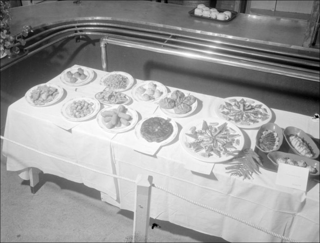 Exposition annuelle de l'École centrale d'arts et métiers. Une partie des kiosques porte sur les cours d'art culinaire : confection de hors-d'oeuvres, pâtisseries, gâteaux et pièces montées, plats de viande et de poisson ainsi que des produits de la boulangerie. La seconde partie présente des créations conçues dans les cours d'horlogerie-bijouterie (E6,S7,SS1,P047307 et E6,S7,SS1,P047308). Reportage réalisé pour l'École centrale d'arts et métiers de la rue Saint-Denis à Montréal et le ministère de la Jeunesse