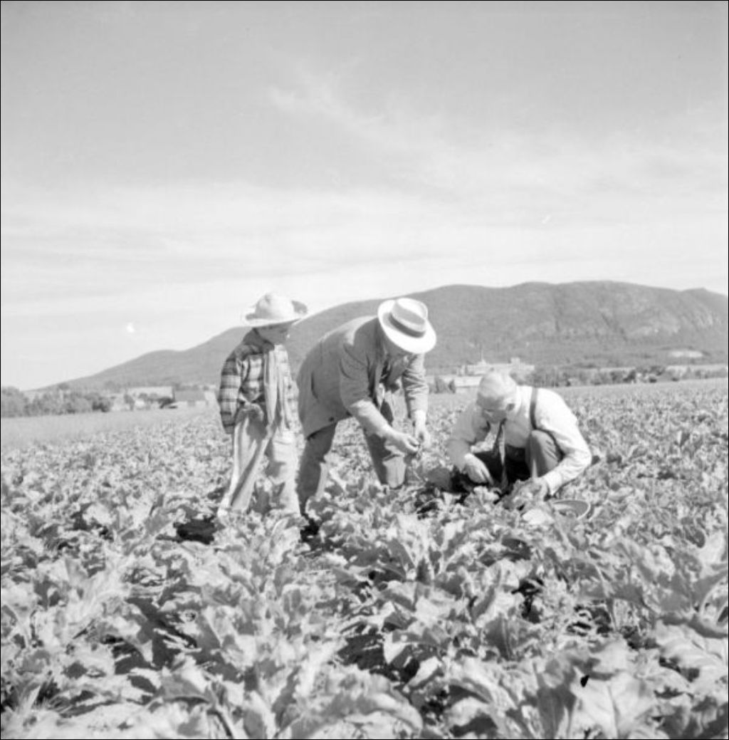 - Culture de la betterave à sucre et de l'orge (E6,S7,SS1,P047492) sur une ferme située à proximité de la raffinerie de betteraves à sucre de Mont-Saint-Hilaire (E6,S7,SS1,P047496). Une autre partie du reportage concerne le congrès de l'Union catholique des cultivateurs (UCC) du Québec (E6,S7,SS1,P047497). Quelques participants sont réunis devant l'hôtel Clarendon de la rue Sainte-Anne à Québec (E6,S7,SS1,P047500), face au parc de l'hôtel de ville où des orateurs s'adressent aux congressistes à proximité d'un monument consacré à Louis Hébert, Marie Rollet et Louis Couillard (E6,S7,SS1,P047499 à E6,S7,SS1,P047502). Ce monument a été déménagé en 1977 au parc Montmorency. Reportage réalisé pour le Service de l'information du ministère de l'Agriculture