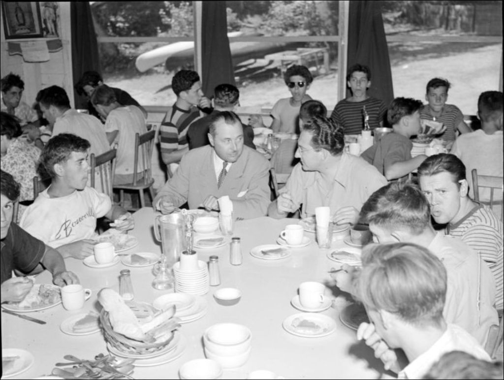 - Camp d'été de Boscoville à Rivière-des-Prairies. Joseph-Mignault-Paul Sauvé, ministre de la Jeunesse, rencontre les éducateurs et les jeunes gens. Nous remarquons la cafétéria du camp, les dortoirs et les chambrettes, les sentiers du site, le terrain de jeux et le rassemblement devant les bâtiments du centre. Reportage produit pour l'Office de publicité du ministère de la Jeunesse