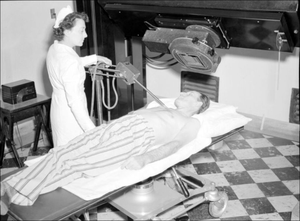 - Traitements du cancer pratiqués à l'hôpital Notre-Dame de Montréal. Les deux premiers cas reçoivent des séances de radiothérapie profonde (E6,S7,SS1,P047866 et E6,S7,SS1,P047867) et le dernier patient subit une chirurgie. Les médecins spécialistes participent à l'intervention au bloc opératoire (E6,S7,SS1,P047868). Images prises pour l'Office provincial de publicité et le ministère de la Santé