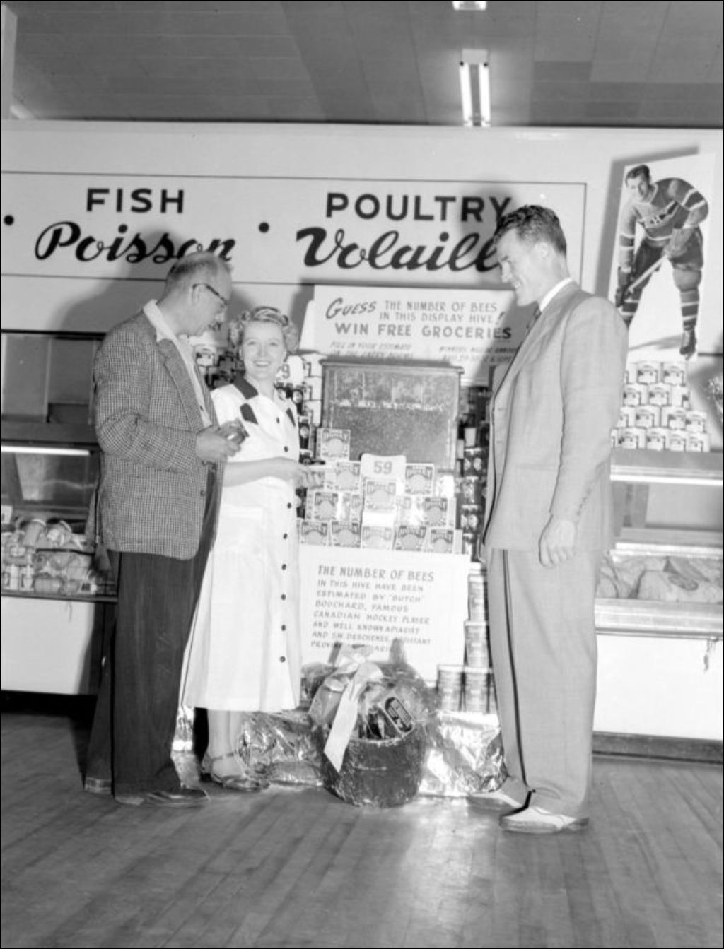 - Le hockeyeur, Butch Bouchard, fait la promotion des produits de son rucher chez S.-W. Deschênes, propriétaire d'une épicerie de Côte-de-Liesse à Montréal. Une affiche du joueur de la Ligue nationale de Hockey surmonte un présentoir. Images produites pour le Service d'apiculture du ministère de l'agriculture