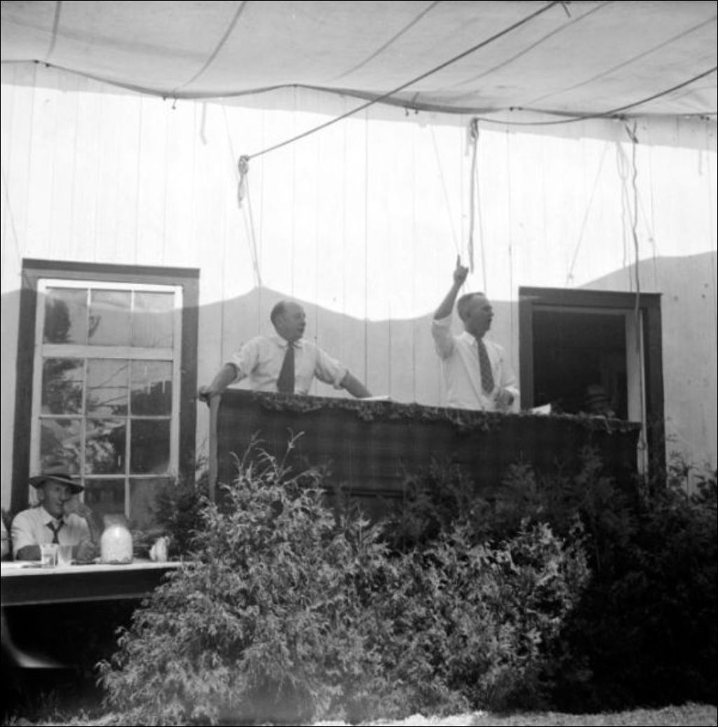 - Vente aux enchères de bovins Ayrshire sur la ferme Burnsise Stock, propriété de Douglas Ness, à Howick. L'éleveur est en compagnie du commissaire-priseur (E6,S7,SS1,P048048, E6,S7,SS1,P048056 et E6,S7,SS1,P048059) qui procède aux enchères sous un grand chapiteau (E6,S7,SS1,P048049). Les acheteurs et les spectateurs assistent à la parade des bêtes (E6,S7,SS1,P048050 etE6,S7,SS1,P048057). Un éleveur mène un taureau Ayrshire dans une remorque (E6,S7,SS1,P048055). Reportage préparé pour le Service de l'information du ministère de l'Agriculture