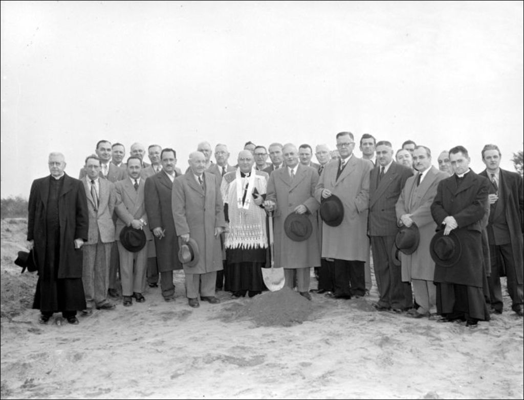 - Le maire et le curé de Plage-Laval, devenu Laval-Ouest (un quartier de ville de Laval), procèdent à la pose de la pierre angulaire d'une nouvelle école. Des citoyens assistent à l'événement. Images prises pour l'Office provincial de publicité et le ministère de la Jeunesse