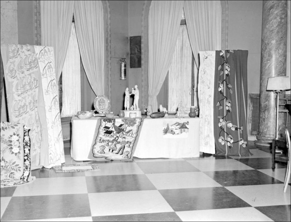 - Exposition provinciale d'artisanat axée surtout sur l'art du textile. Elle a été organisée dans le cadre d'une conférence donnée par le ministère des Mines. Assistent à l'événement le ministre des mines, C.D. French, et Roland Patenaude, ministre du Tourisme (E6,S7,SS1,P048442). Reportage produit pour le Bureau du tourisme et l'Office provincial de publicité