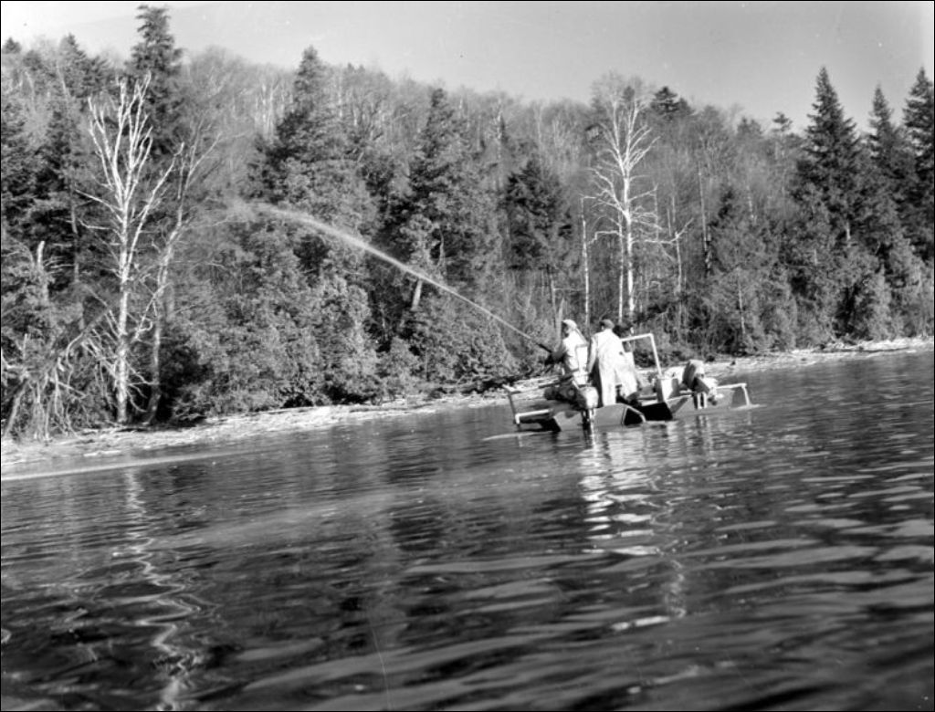 - Biologistes de l'Office de biologie du Québec travaillant à contrer la pollution des lacs Lyster et Baldwyn situés à Barnston près du lac Memphrémagog. Des produits chimiques sont déversés (E6,S7,SS1,P048554) à partir de l'équipement posé sur des chaloupes à moteur (E6,S7,SS1,P048560, E6,S7,SS1,P048562). Ce reportage a été réalisé pour l'Office de biologie et le ministère de la Chasse et de la Pêche