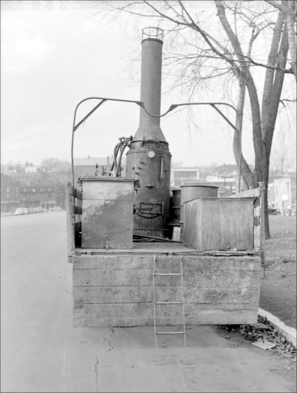 - Système destiné à la stérilisation des rûchers. Un employé du ministère de l'Agriculture (E6,S7,SS1,P048578) procède à une opération de stérilisation à Saint-Martin (devenu un quartier de ville de Laval). Il utilise un camion-remorque (E6,S7,SS1,P048567) et une cuve de stérilisation (E6,S7,SS1,P048572 à E6,S7,SS1,P048574) reliée à une cheminée. Images prises pour le Service d'apiculture du ministère de l'Agriculture