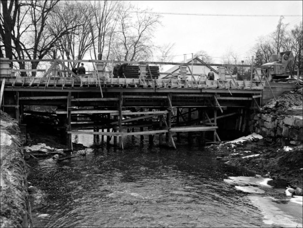 - Travaux de remblayage en vue de combler la cavité sous le pont de Knowlton et de détourner le cours d'eau. Images exécutées pour le Service de la voirie et le ministère des Travaux publics