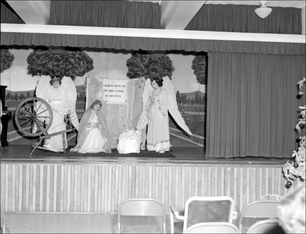 - Dîner de Noël servi dans les locaux de l'Hôpital de la Miséricorde à la suite d'une représentation théâtrale illustrant la nativité du Christ. Nous apercevons la Vierge Marie et l'Enfant-Jésus entourés des archanges. Reportage produit pour l'Office provincial de publicité