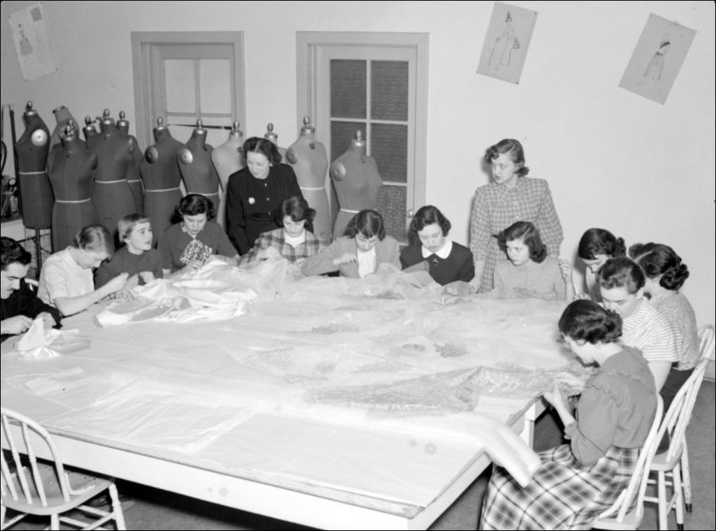 Étudiantes de la classe de couture de l'École centrale d'arts et métiers située sur la rue Saint-Denis à Montréal. Selon la coutume, les étudiantes conçoivent la robe que portera Miss Radio 1950, Muriel Millard. Dossier produit pour l'École centrale d'arts et métiers, ministère de la Jeunesse