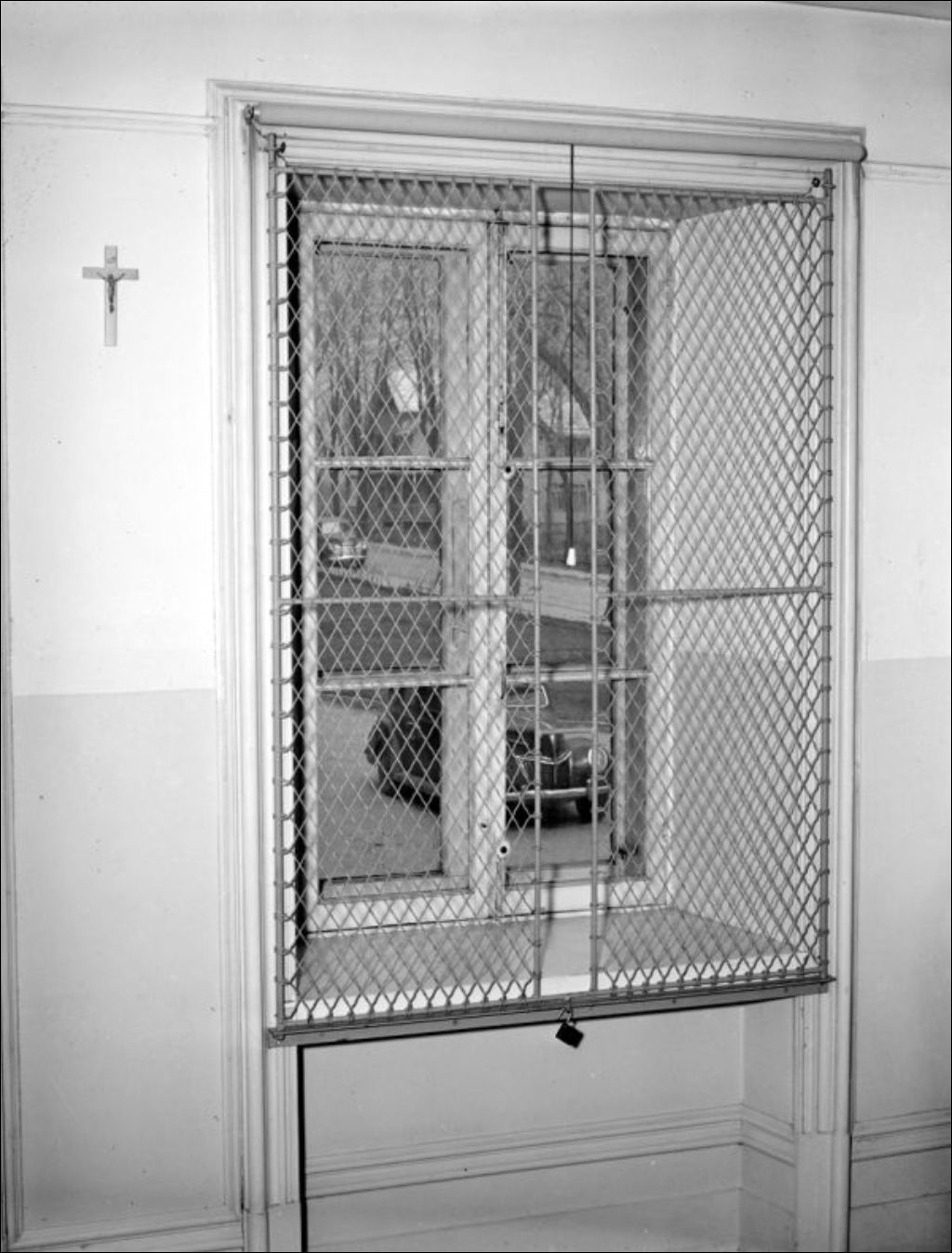 - Il s'agit des grilles de protection des fenêtres de l'Hôpital Notre-Dame de l'Espérance (devenu l'Hôpital de Saint-Laurent) situé à Ville Saint-Laurent. Nous remarquons un gardien qui vérifie les grilles des fenêtres (E6,S7,SS1,P49493) du département de psychiatrie. Dossier produit pour le Bureau du Shérif, Procureur général
