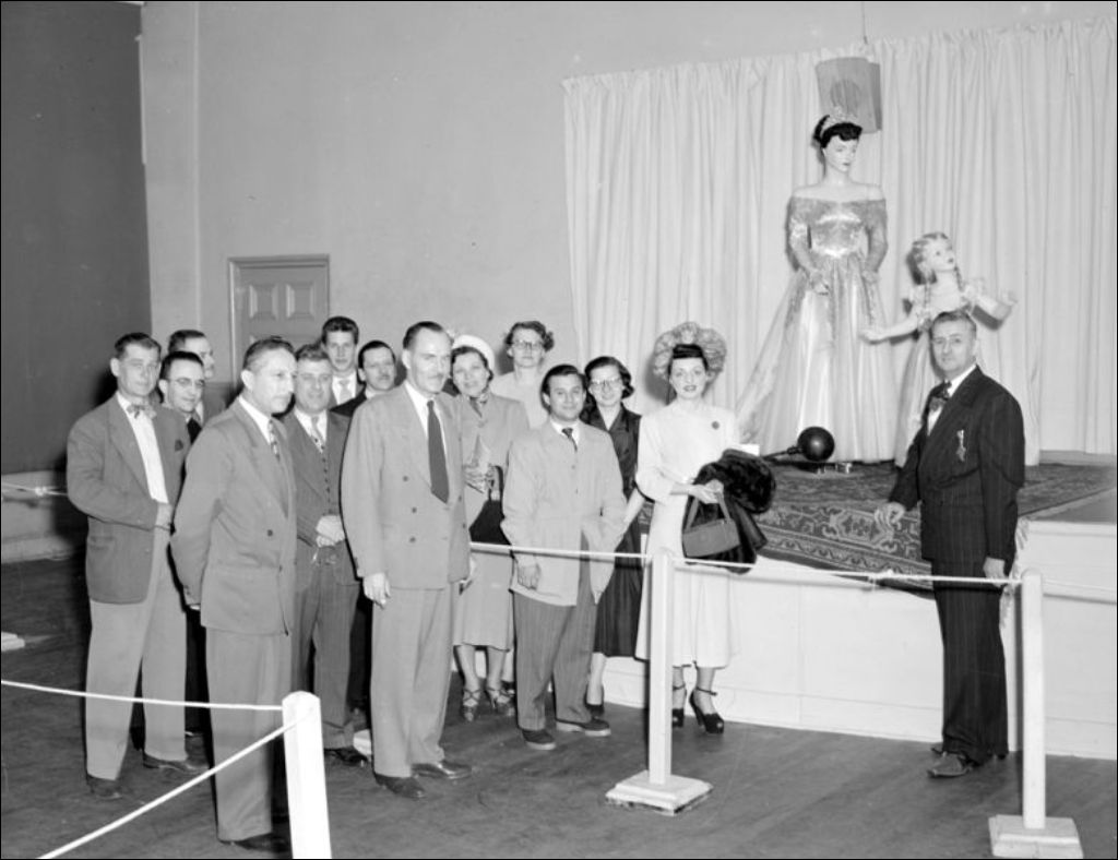 E.C.A.M., ministère de la Jeunesse. (Miss Radio 1950 visitant l'exposition de l'E.C.A.M.), Juin 1950, Archives nationales à Montréal, Fonds Ministère de la Culture et des Communications, (06M,E6,S7,SS1,D49910-49910), Joseph Guibord.