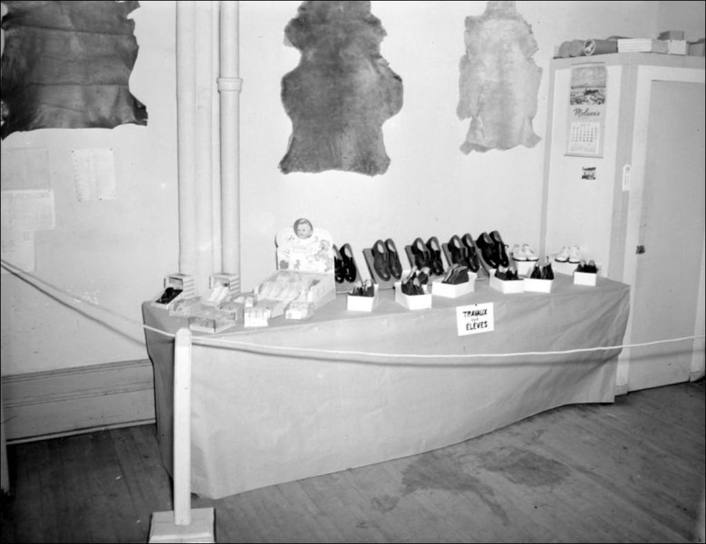 - Exposition annuelle de l'École centrale d'arts et métiers située sur la rue Saint-Denis à Montréal. Nous retrouvons des kiosques sur la chaussure tels que les compagnies Narwill Shoe située sur la rue Saint-Timothée à Montréal (E6,S7,SS1,P49924), Robin Frères Limitée de la rue Gilford à Montréal (E6,S7,SS1,P49926), Merry-go-Round Shoes (E6,S7,SS1,P49928) et Golden Pheasant Shoes (E6,S7,SS1,P49929). Nous apercevons les travaux d'étudiants (E6,S7,SS1,P49922 et E6,S7,SS1,P49923) et la machinerie utilisée (E6,S7,SS1,P49927) en atelier de cordonnerie (E6,S7,SS1,P49925). L'exposition traite également des cours de barbiers (E6,S7,SS1,P49930) et de coiffure (E6,S7,SS1,P49934) donnés par l'école. Enfin, nous remarquons des kiosques sur le dessin (E6,S7,SS1,P49931) et la confection (E6,S7,SS1,P49932 et E6,S7,SS1,P49933) de manteaux de fourrure. Les scènes ont été photographiées pour l'École centrale d'arts et métiers, ministère de la Jeunesse