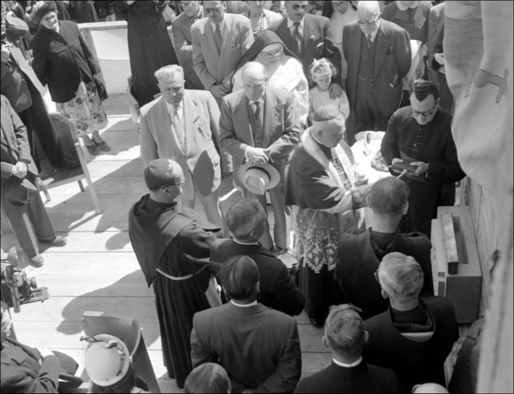 - Bénédiction de la Maison familiale Saint-Joseph, à l'angle des rues Beauregard et LaSalle dans le village de Jacques-Cartier, devenu la ville de Longueuil. Nous retrouvons la foule (E6,S7,SS1,P50123 à E6,S7,SS1,P50125) qui assiste à la cérémonie (E6,S7,SS1,P50116 et E6,S7,SS1,P50126). Nous apercevons également les invités d'honneur (E6,S7,SS1,P50127) qui prononcent un discours (E6,S7,SS1,P50117, E6,S7,SS1,P50119, E6,S7,SS1,P50120 et E6,S7,SS1,P50128). Parmi les invités, nous reconnaissons J.-H. Albiny Paquette, ministre de la Santé, et Paul-Ernest-Anastase Forget, évêque du diocèse de Saint-Jean-de-Québec devenu le diocèse Saint-Jean-Longueuil. Les scènes ont été photographiées pour le Service de publicité, Conseil exécutif