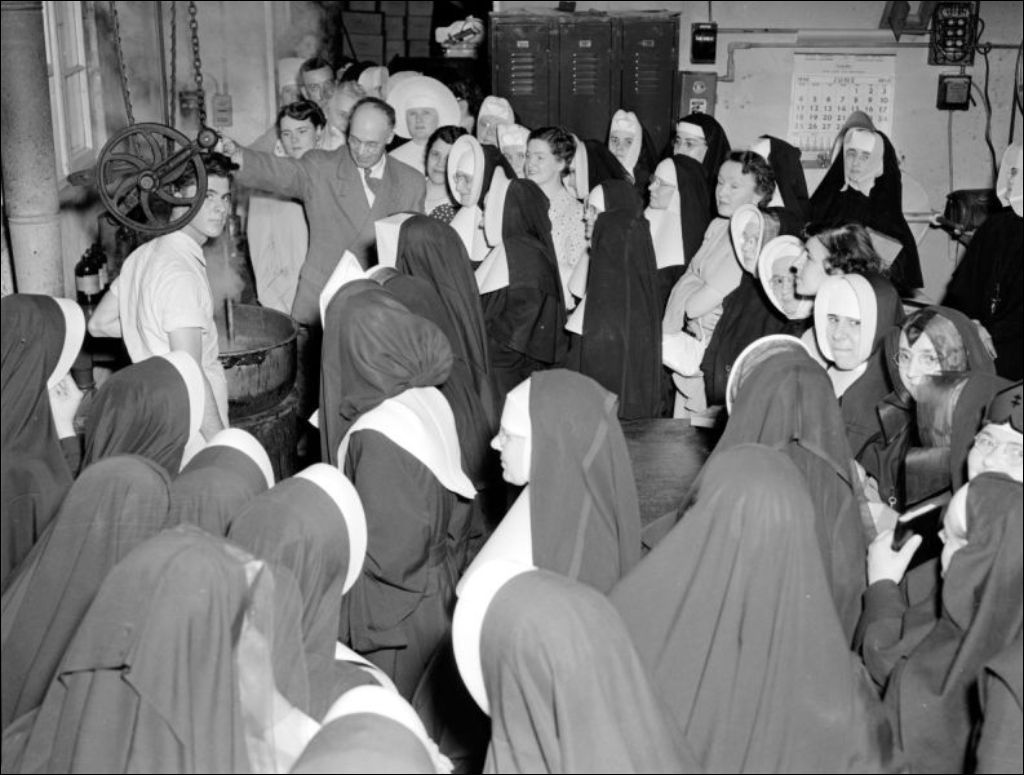 Il s'agit de religieuses de différentes congrégations qui visitent une compagnie de fabrication de vaisselle de même que l'Évêché et l'École ménagère de Joliette. Nous retrouvons les soeurs qui visitent le personnel et les installations de l'entreprise de vaisselle (E6,S7,SS1,P50234, E6,S7,SS1,P50235, E6,S7,SS1,P50239, E6,S7,SS1,P50240, E6,S7,SS1,P50243 et E6,S7,SS1, P50244). Joseph-Arthur Papineau, évêque de Joliette, accueille les invitées (E6,S7,SS1,P50236 et E6,S7,SS1,P50238). Enfin, nous remarquons les religieuses devant l'École ménagère (E6,S7,SS1,P50245). Reportage produit pour le Département de l'instruction publique, Secrétariat provincial