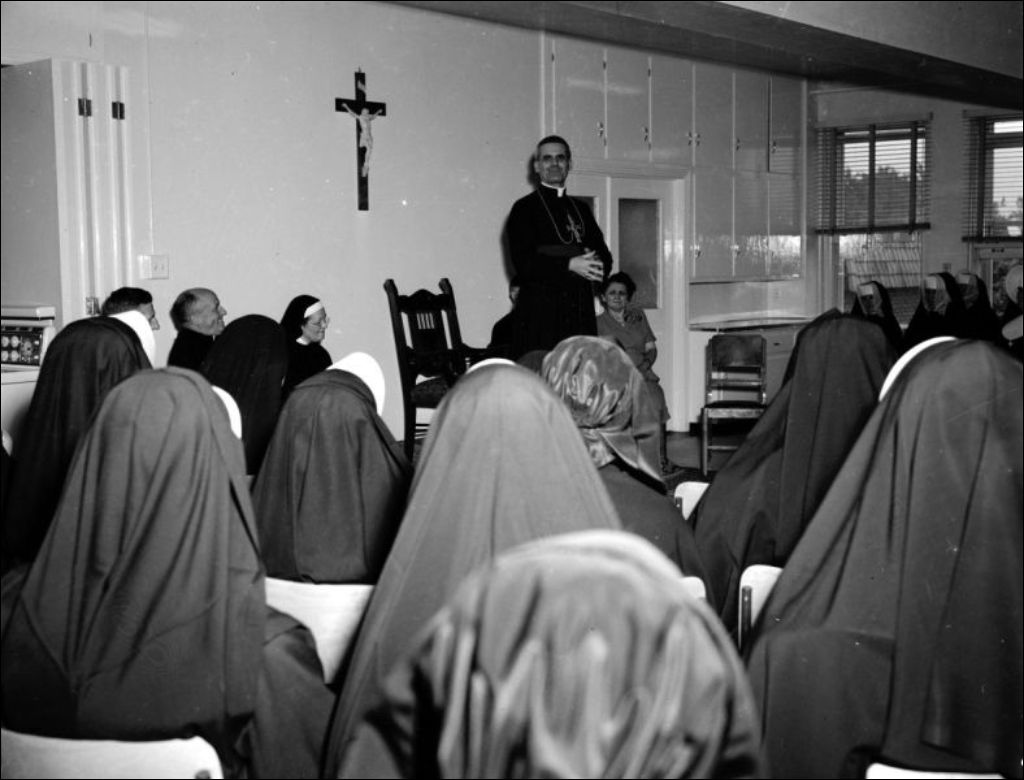 - Visite de Paul-Émile Léger, archevêque de Montréal, à l'École de l'éducation familiale et sociale située sur le boulevard Saint-Joseph Est à Montréal. Nous retrouvons l'archevêque qui prononce un discours (E6,S7,SS1,P50247) et qui rencontre les religieuses ainsi que les étudiantes de l'École (E6,S7,SS1,P50248). Enfin, nous remarquons les religieuses (E6,S7,SS1,P50250), les invités d'honneur (E6,S7,SS1,P50249) attablés (E6,S7,SS1,P50252). Reportage produit pour le Département de l'instruction publique, Secrétariat provincial