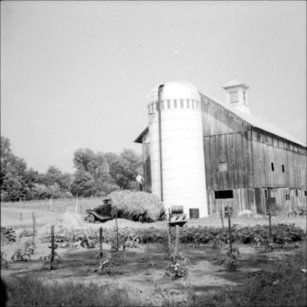 - Vues du Hew-Hampshire et de Cavendish dans le Vermont aux États-Unis. Au New-Hampshire, nous retrouvons l'ensilage des fourrages (E6,S7,SS1,P50293), une route située le long de la rivière Connecticut (E6,S7,SS1,P50294) et les membres de la Canadian Industries Limited (E6,S7,SS1,P50298 et E6,S7,SS1,P50299). À la ferme Leland Slayton située à Warner au New-Hampshire, nous apercevons les silos et le fourrage engrangé (E6,S7,SS1,P50296) ainsi que Moïse Cossette, agronome du Bulletin des agriculteurs, étendu dans l'herbe (E6,S7,SS1,P50300). À la ferme de A. W. Kingsbury située à Cavendish au Vermont, nous remarquons un troupeau de vaches Guernesey (E6,S7,SS1,P50305). Dossier produit pour le Service de l'information, ministère de l'Agriculture
