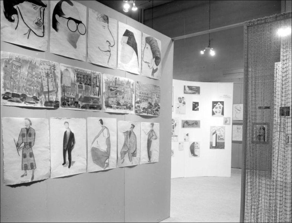- Exposition de travaux d'étudiants produits à l'École des Beaux-Arts située sur la rue Saint-Urbain à Montréal. Nous retrouvons des oeuvres produites par les étudiants dans le cadre du cours d'illustration donné par Frédéric Back et René Caron (E6,S7,SS1,P50803) ainsi que la sculpture sur pierre donné par l'enseignant Armand Filion (E6,S7,SS1,P50807). Dossier produit pour l'École des Beaux-Arts, Secrétariat provincial