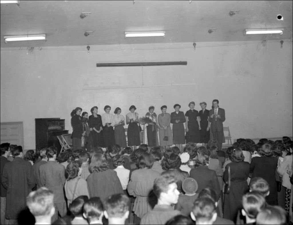 Couronnement de la Reine des sports de l'École centrale d'arts et métiers située sur la rue Saint-Denis à Montréal. Dossier produit pour l'École centrale d'arts et métiers, ministère de la Jeunesse