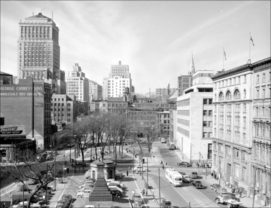 - Vues de Montréal avec le square Victoria (E6,S7,SS1,P51083), le square Phillips et le monument à la mémoire d'Édouard VII (E6,S7,SS1,P51084) et l'oratoire Saint-Joseph situé sur le chemin de la Reine-Marie (E6,S7,SS1,P51085). Nous remarquons aussi la cathédrale Marie-Reine du Monde de Montréal, le boulevard Dorchester devenu boulevard René-Lévesque (E6,S7,SS1,P51086) et l'église Notre-Dame, rue Notre-Dame Est à Montréal (E6,S7,SS1,P51087). Reportage produit pour le Service du tourisme, Office provincial de publicité