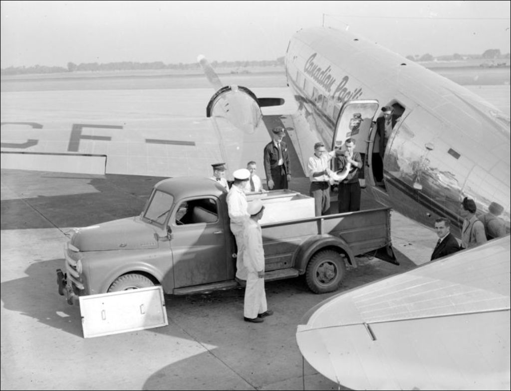 Il s'agit de l'expédition de poissons à partir de l'aéroport de Dorval. Le chargement est destiné à l'exposition sur la pêche tenue à Rouyn (devenu Rouyn-Noranda). Nous assistons à l'embarquement des poissons (E6,S7,SS1,P51209) et de l'équipement (E6,S7,SS1,P51210 et E6,S7,SS1,P51212) dans l'avion du Canadian Pacific. Reportage produit pour l'Office de biologie, ministère de la Chasse et de la Pêche