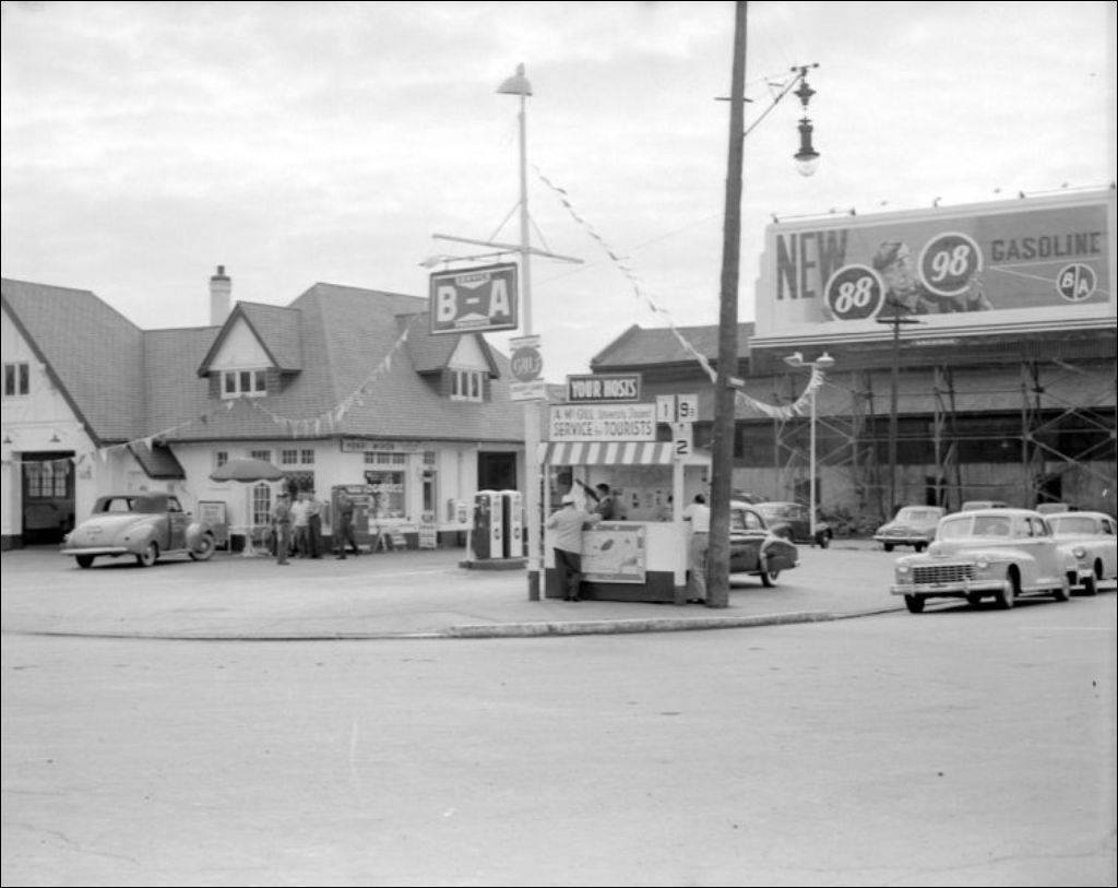 Il s'agit d'un kiosque d'information touristique situé à proximité du pont Jacques-Cartier à Montréal. Nous remarquons des étudiants de l'Université McGill qui renseignent les touristes de même qu'une station-service. La scène a été photographiée pour le Service de tourisme de l'Office provincial de publicité