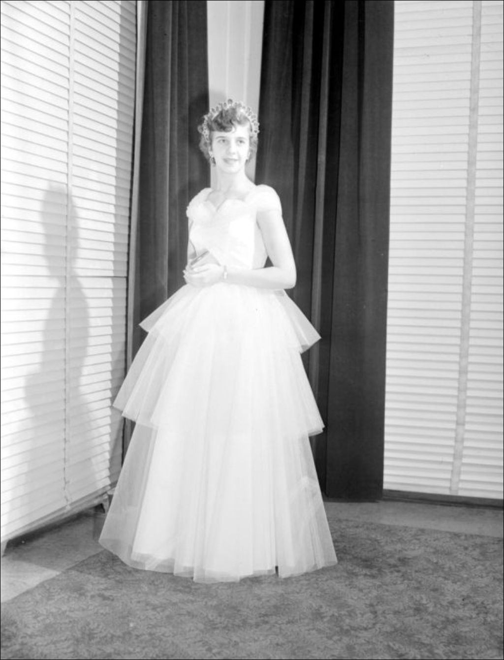 Il s'agit de la lauréate au titre de Reine des sports de l'École centrale d'arts et métiers située sur la rue Saint-Denis à Montréal. Elle porte une robe créée par les étudiantes de la classe de couture. La scène a été réalisée pour le Service de l'École centrale d'arts et métiers du ministère du Bien-être social et de la Jeunesse