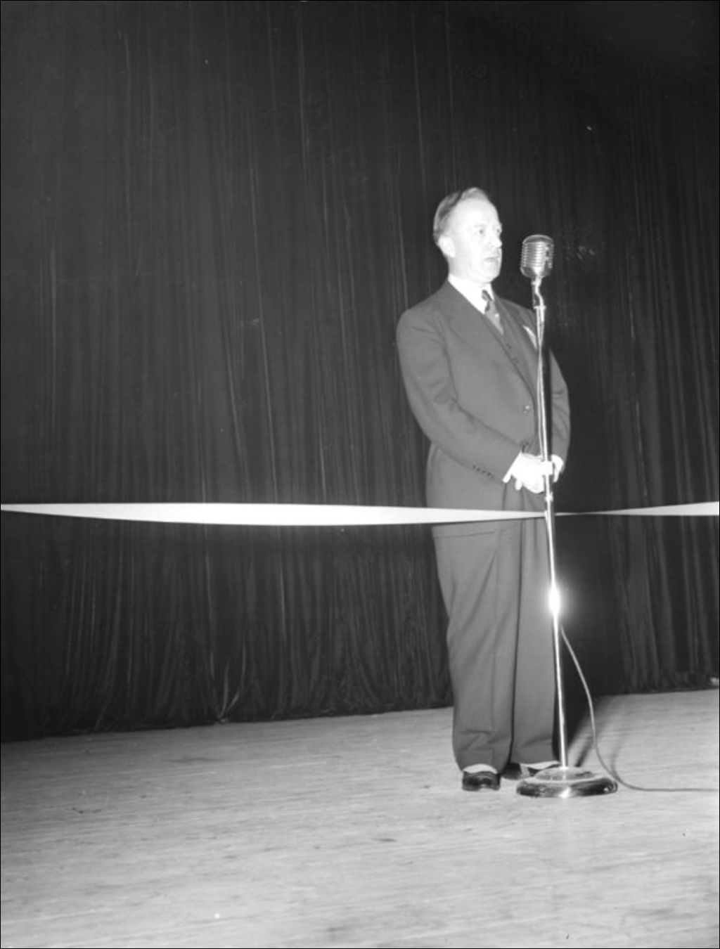 - Il s'agit de l'Exposition industrielle présentée à la Chambre de commerce des jeunes située à Saint-Jean (devenue Saint-Jean-sur-Richelieu). Nous remarquons Paul Beaulieu, ministre du Commerce et de l'Industrie prononçant son allocution (E6,S7,SS1,P51873); coupant le ruban lors de la cérémonie d'ouverture (E6,S7,SS1,P51874); s'attardant aux tables des exposants (E6,S7,SS1,P51876 à E6,S7,SS1,P51880). Les scènes ont été photographiées pour le Service de publicité du ministère du Commerce et de l'Industrie