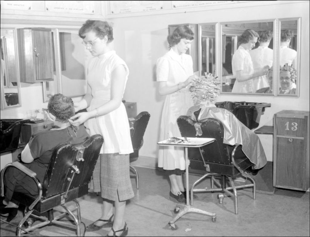 Il s'agit des étudiantes du cours de coiffure de l'École centrale d'arts et métiers située sur la rue Saint-Denis à Montréal. Les images seront utilisées pour illustrer la «Revue technique». Nous remarquons les apprenties avec les clientes. La scène a été photographiée pour la Revue Technique et le ministère du Bien-être social et de la Jeunesse