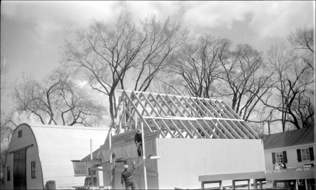 - Il s'agit de la construction de la station de pisciculture de Lachine. Nous remarquons la charpente du bâtiment en construction et les travailleurs, des navires dans le port à proximité de la station de pisciculture; un émondeur coupant la branche d'un arbre; un ruisseau à proximité de la station de pisciculture. Les scènes ont été photographiées pour l'Office de biologie et le ministère de la Chasse et de la Pêche