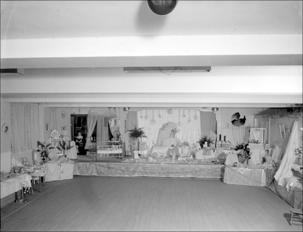 - Il s'agit probablement de l'exposition des travaux d'étudiantes de l'École supérieure de pédagogie familiale et d'enseignement ménager située sur la rue Mont-Royal à Montréal. Parmi les objets exposés se trouvent des vêtements et accessoires pour bébés; des vêtements produits par la classe de couture; des oeuvres en céramique; des sacs; des tissus brodés et tissés à l'aide d'un métier de basse lisse. Certaines tables offrent des oeuvres culinaires. Les scènes ont été photographiées pour le Service de l'instruction publique du Secrétariat provincial