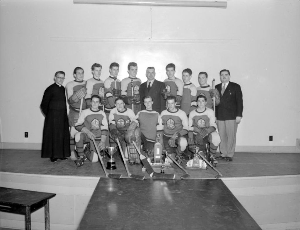 - Il s'agit de l'équipe de hockey de l'École centrale d'arts et métiers située sur la rue Saint-Denis à Montréal. Nous remarquons les joueurs en compagnie de monsieur Bélisle, directeur de l'École (E6,S7,SS1,P52396) et deux membres de l'équipe avec un trophée (E6,S7,SS1,P52397). Les scènes ont été photographiées pour l'École centrale d'arts et métiers et le ministère du Bien-être social et de la Jeunesse