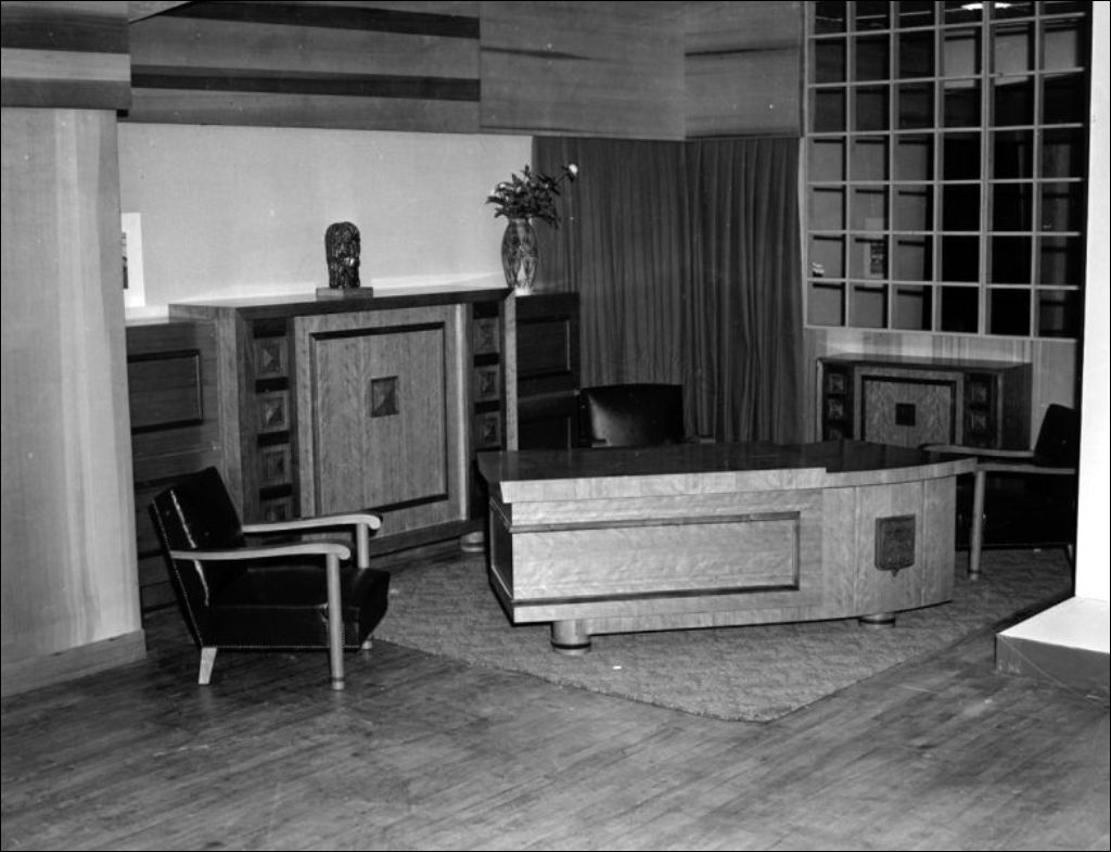 - Il s'agit d'une exposition des travaux des étudiants de l'École du meuble située sur la rue Berri à Montréal. Parmi la production exposée, nous remarquons le mobilier de bureau (E6,S7,SS1,P52451); de salle de séjour (E6,S7,SS1,P52452); de salle à manger (E6,S7,SS1,P52453), rouet (E6,S7,SS1,P52454); les tissus utilisés pour la décoration d'un salon (E6,S7,SS1,P52455); une gravure sur bois présentant des étapes de la vie du Christ (E6,S7,SS1,P52456). Les scènes ont été photographiées pour la Revue technique et le ministère du Bien-être social et de la Jeunesse