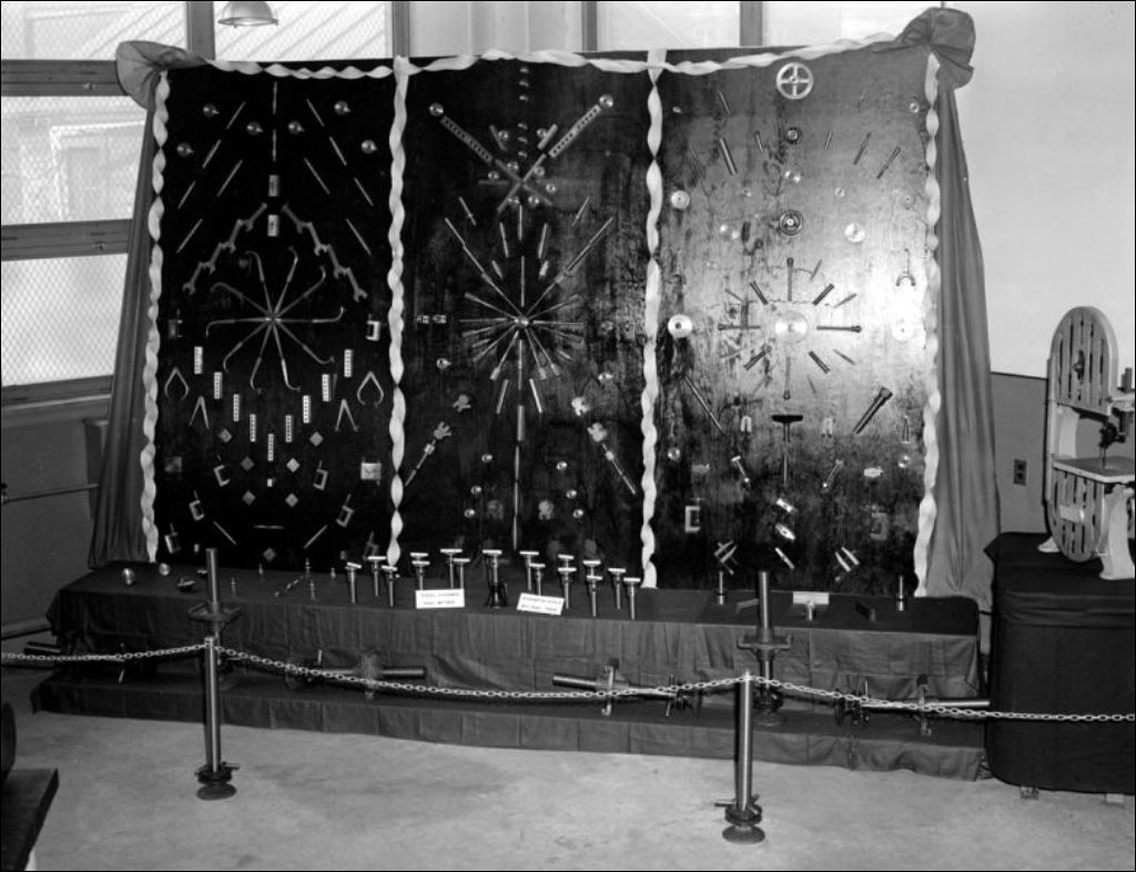 - Il s'agit d'une exposition de travaux des étudiants de l'école Saint-Henri située à Montréal. Nous remarquons de la quincaillerie et des articles de fer forgé (E6,S7,SS1,P52572); des articles de ventilation et de plomberie en fer-blanc (E6,S7,SS1,P52574). Les scènes ont été photographiées pour la Revue technique et le ministère du Bien-être social et de la Jeunesse