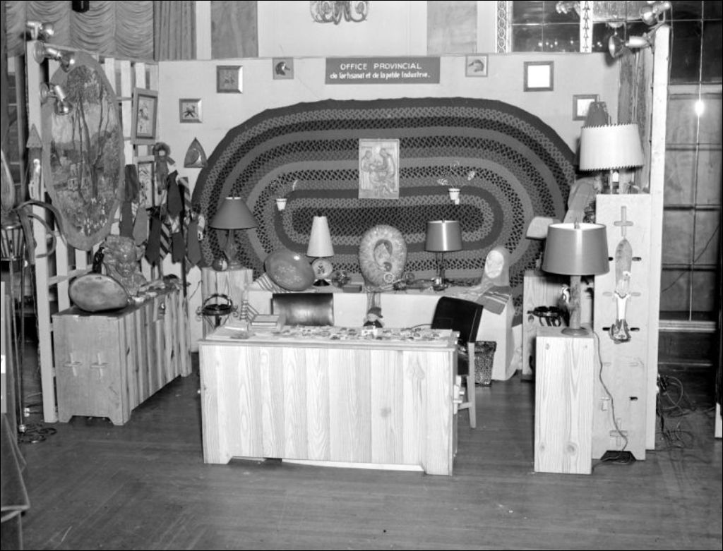 Il s'agit du kiosque de l'Office provincial de l'artisanat et de la petite industrie présenté lors d'une exposition tenue à l'hôtel Mont-Royal situé sur la rue Peel à Montréal. Nous remarquons des lampes, de la poterie, des objets en fer forgé, des cravates et des gravures sur bois. La scène a été photographiée pour le Service de tourisme de l'Office provincial de publicité