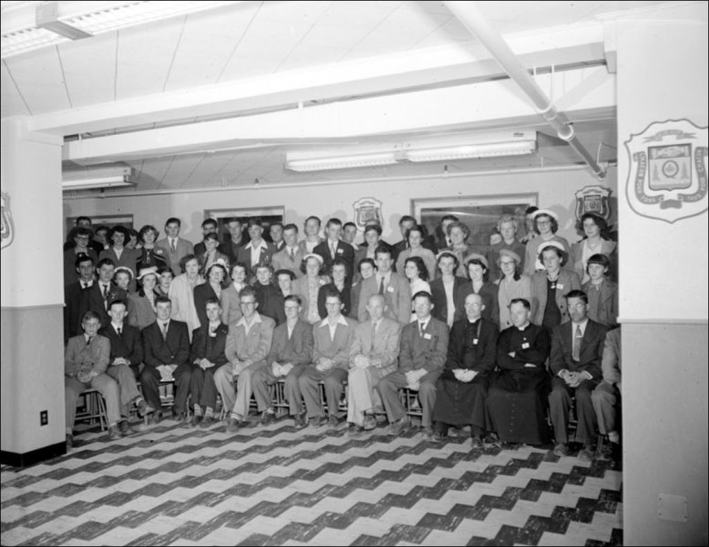 Il s'agit du groupe de jeunes agriculteurs de Mont-Laurier en visite à la Coopérative fédérée de Québec située sur la rue Saint-Paul Est à Montréal. La scène a été photographiée pour le Service de l'information du ministère de l'Agriculture