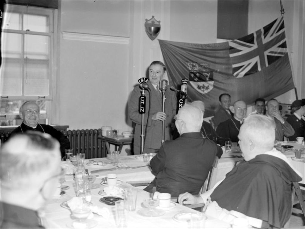 - Il s'agit d'un groupe de pèlerins réunis au sanctuaire du Cap-de-la-Madeleine. Nous remarquons Maurice Duplessis, premier ministre, prononçant son allocution (E6,S7,SS1,P53235 et E6,S7,SS1,P53236); Georges Léon Pelletier, évêque de Trois-Rivières, Maurice Roy, archevêque de Québec et Paul-Émile Léger, archevêque de Montréal, à la table d'honneur (E6,S7,SS1,P53237); Paul-Émile Léger prononçant la messe (E6,S7,SS1,P53238). Nous remarquons également les pèlerins (E6,S7,SS1,P53239 à E6,S7,SS1,P53242), dont plusieurs sont malades ou handicapés, présents au salut du Saint-Sacrement. Les scènes ont été photographiées pour le Service de ciné-photographie de l'Office provincial de publicité