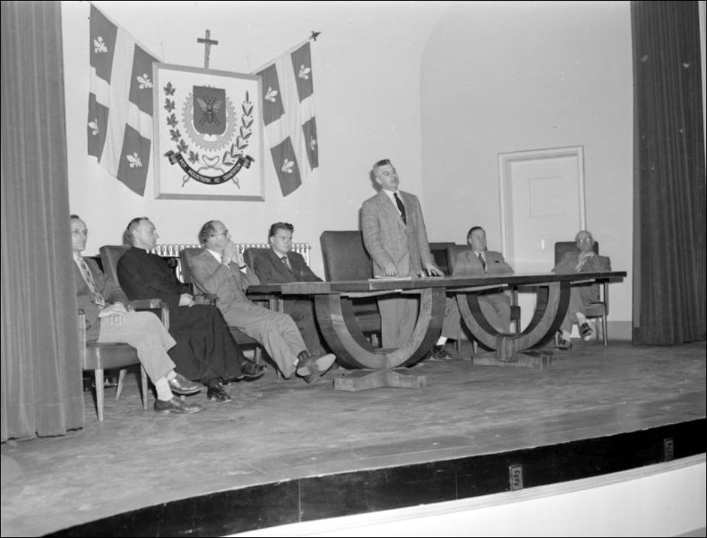 - Nomination de R. Belisle à titre de directeur de l'École technique située sur la rue Sherbrooke Ouest à Montréal. Nous le retrouvons alors qu'il prononce un discours (E6,S7,SS1,P53775) aux étudiants réunis (E6,S7,SS1,P53777). Le directeur est félicité par des collègues (E6,S7,SS1,P53776). Reportage produit pour le Service de l'aide à la jeunesse, ministère du Bien-être social et de la Jeunesse