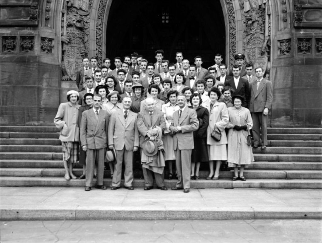 - Congrès des Jeunes éleveurs de Joliette. Nous retrouvons les congressistes réunis (E6,S7,SS1,P53921, E6,S7,SS1,P53926 et E6,S7,SS1,P53930) autour d'un monument en l'honneur de Champlain (E6,S7,SS1,P53929). Les jeunes visitent des jardins (E6,S7,SS1,P53923 et E6,S7,SS1,P53925) et des plans d'eau (E6,S7,SS1,P53924). Dans une embarcation, les éleveurs naviguent sur un cours d'eau (E6,S7,SS1,P53927). Dossier produit pour le Service de l'hôtellerie, ministère du Commerce et de l'Industrie