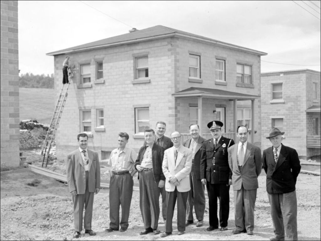 - Vues de la Coopérative d'habitation de Port-Alfred, secteur de La Baie. Le maire J. E. A. Beaulieu, et les échevins Narcisse Rioux, Pierre-L. Bergeron, Philippe Potvin et Philippe Genelle visitent les résidences en construction en compagnie du président, vice-président et gérant de la Coopérative, Eugène Labrie, L. Torressan et Isachare Leclerc (E6,S7,SS1,P54119 et E6,S7,SS1,P54121). Nous remarquons une vue du quartier (E6,S7,SS1,P54122). Dossier produit pour le ministère de l'Agriculture