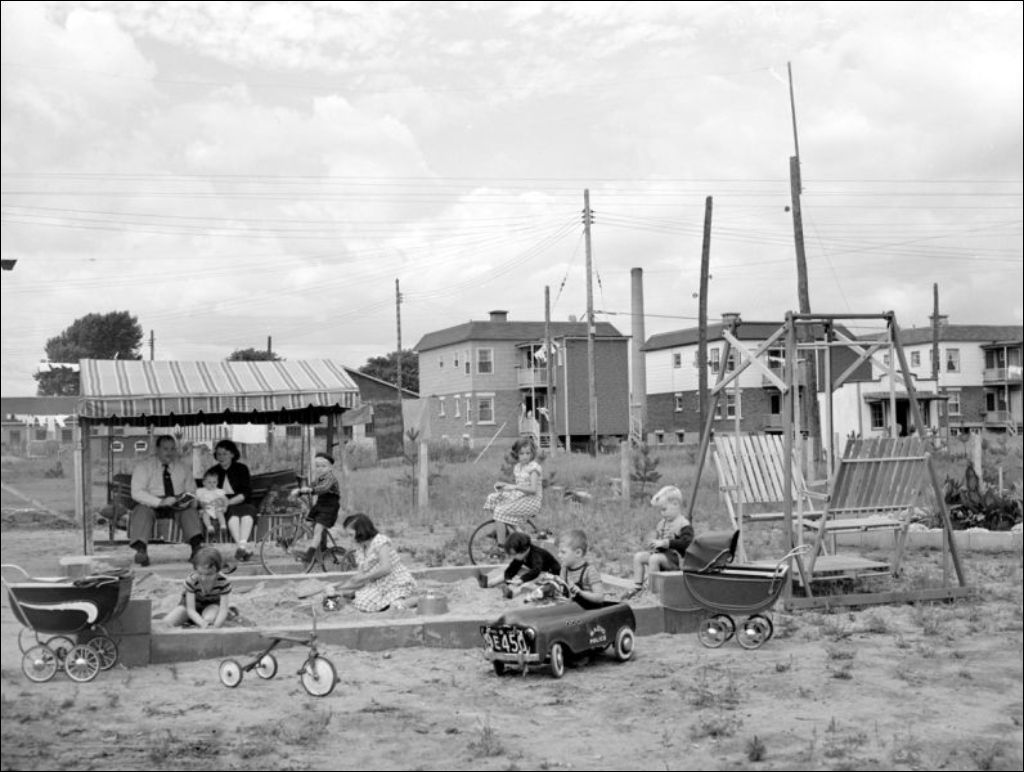 - Coopérative d'habitation située à Joliette. Nous retrouvons un parc d'enfants (E6,S7,SS1,P54207). Nous remarquons les résidences de Marcel Tissot sur la rue Calixa-Lavallée (E6,S7,SS1,P54208), de Georges-Étienne Marsolais sur la rue Champagne (E6,S7,SS1,P54210) et de monsieur Moreau sur la rue Papineau (E6,S7,SS1,P54211). En construction, nous apercevons l'école Christ-Roi (E6,S7,SS1,P54212) et l'église de la paroisse Sainte-Thérèse-de-l'Enfant-Jésus (E6,S7,SS1,P54214) ainsi que l'édifice de l'église précédente (E6,S7,SS1,P54215). La famille de M. J. Samuel jardine à l'arrière de la maison située sur la rue Gauthier (E6,S7,SS1,P54216). Nous remarquons la maison d'Albert Bonneau (E6,S7,SS1,P54217). Le facteur distribue les lettres sur la rue Robitaille (E6,S7,SS1,P54221). Le curé Félix Gadoury examine le travail de peinture (E6,S7,SS1,P54223) et il est en compagnie des enfants des coopérateurs de la rue Calixa-Lavallée (E6,S7,SS1,P54224). Dossier produit pour le ministère de l'Agriculture