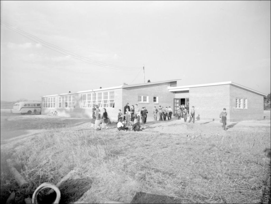 Vues de Thurso, Hull (devenu Gatineau), Brownsburg-Chatham et Drummondville. Nous retrouvons les bâtiments des écoles protestantes situées à Thurso (E6,S7,SS1,P54505) et à Hull, ainsi que l'école Brownsburg Intermediate School située à Brownsburg-Chatam (E6,S7,SS1,P54507). Enfin, à Drummondville, nous apercevons le bâtiment de l'école secondaire Drummondville High School (E6,S7,SS1,P54508) et l'autobus scolaire (E6,S7,SS1,P54509). Dossier produit pour Service de l'instruction publique, Secrétariat provincial