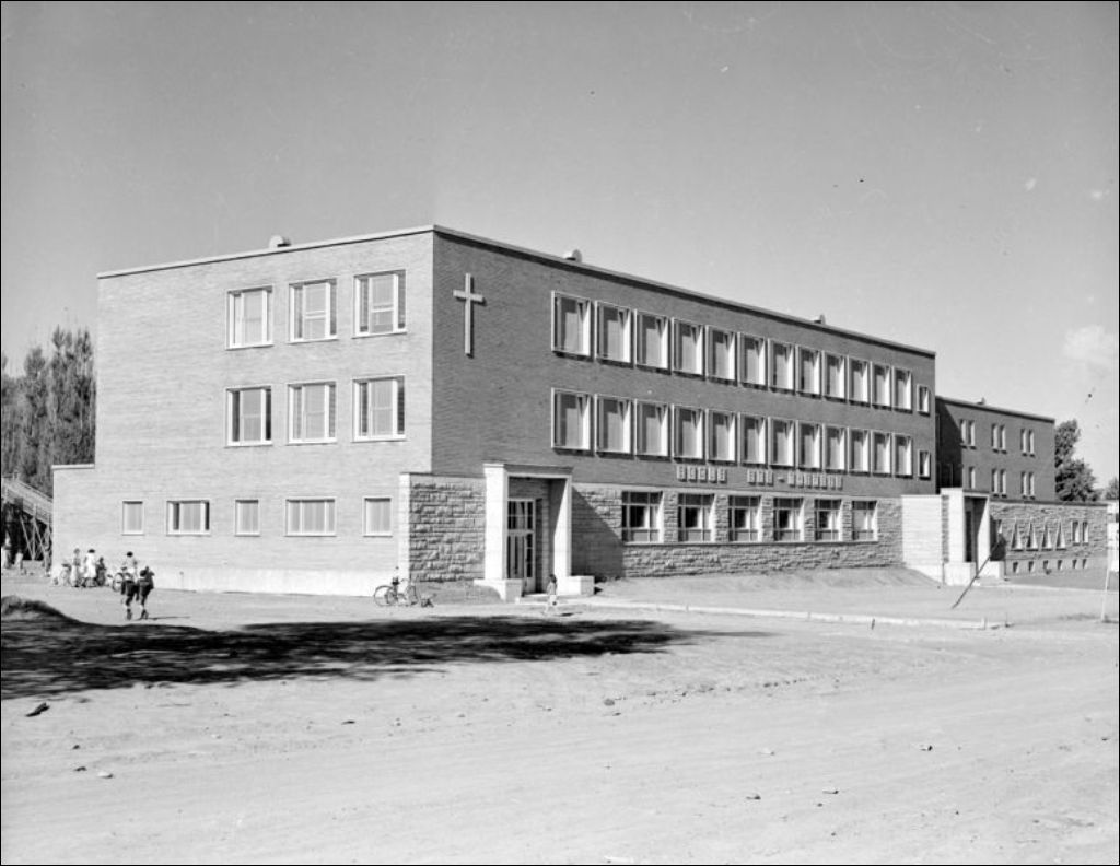 Il s'agit de l'École Sainte-Thérèse située sur le boulevard Saint-Joseph à Cowansville. Nous apercevons le bâtiment. Reportage produit pour le Service de l'instruction publique, Secrétariat provincial