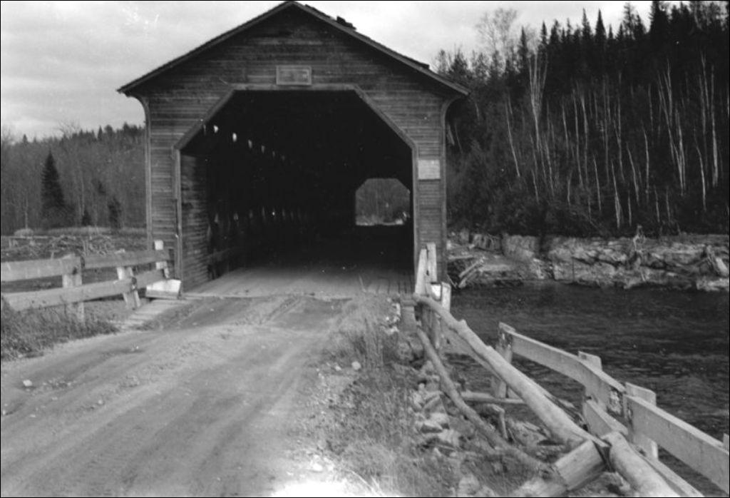 - Le dossier porte sur un pont couvert en bois en construction. Nous apercevons l'entrée (E6,S7,SS1,P55125) et les structures latérales du pont (E6,S7,SS1,P55128 et E6,S7,SS1,P55130). Nous retrouvons une vue du pont après la construction (E6,S7,SS1,P55132). Les scènes ont été photographiées pour le ministère de l'Agriculture