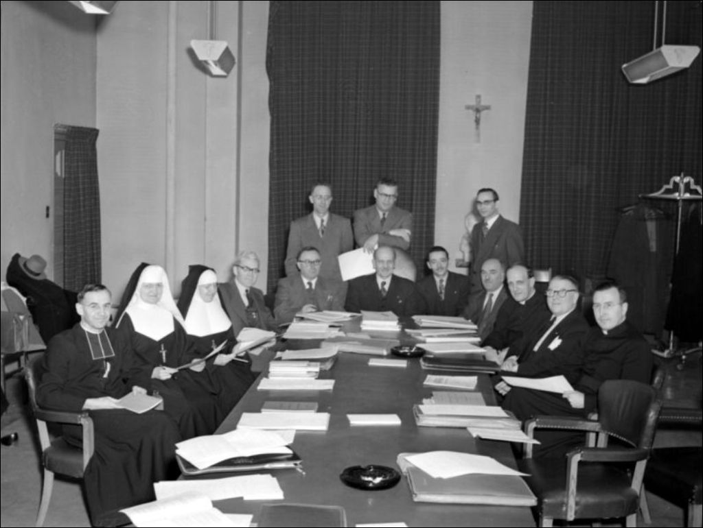 Il s'agit d'un groupe de professeurs comprenant des frères, des soeurs et des laïcs. La scène a été photographiée pour le Service d'aide à la jeunesse du ministère du Bien-être social et de la Jeunesse