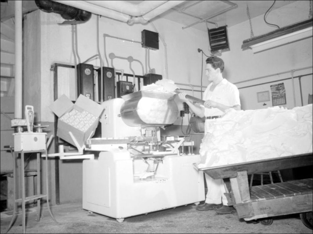 Il s'agit de la Coopérative de beurre de Granby. Nous remarquons un employé alimentant en beurre une machine effectuant l'emballage (E6,S7,SS1,P55350); le bâtiment de l'usine; un employé préparant une boîte pour l'expédition (E6,S7,SS1,P55352). Les scènes ont été photographiées pour l'Office provincial de publicité